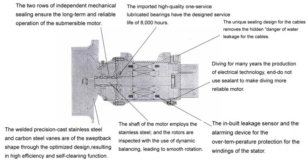 O equipamento é composto por motor submersível, hélices, sistema de instalação, entre outros componentes. O misturador submersível adota uma estrutura de conexão direta.